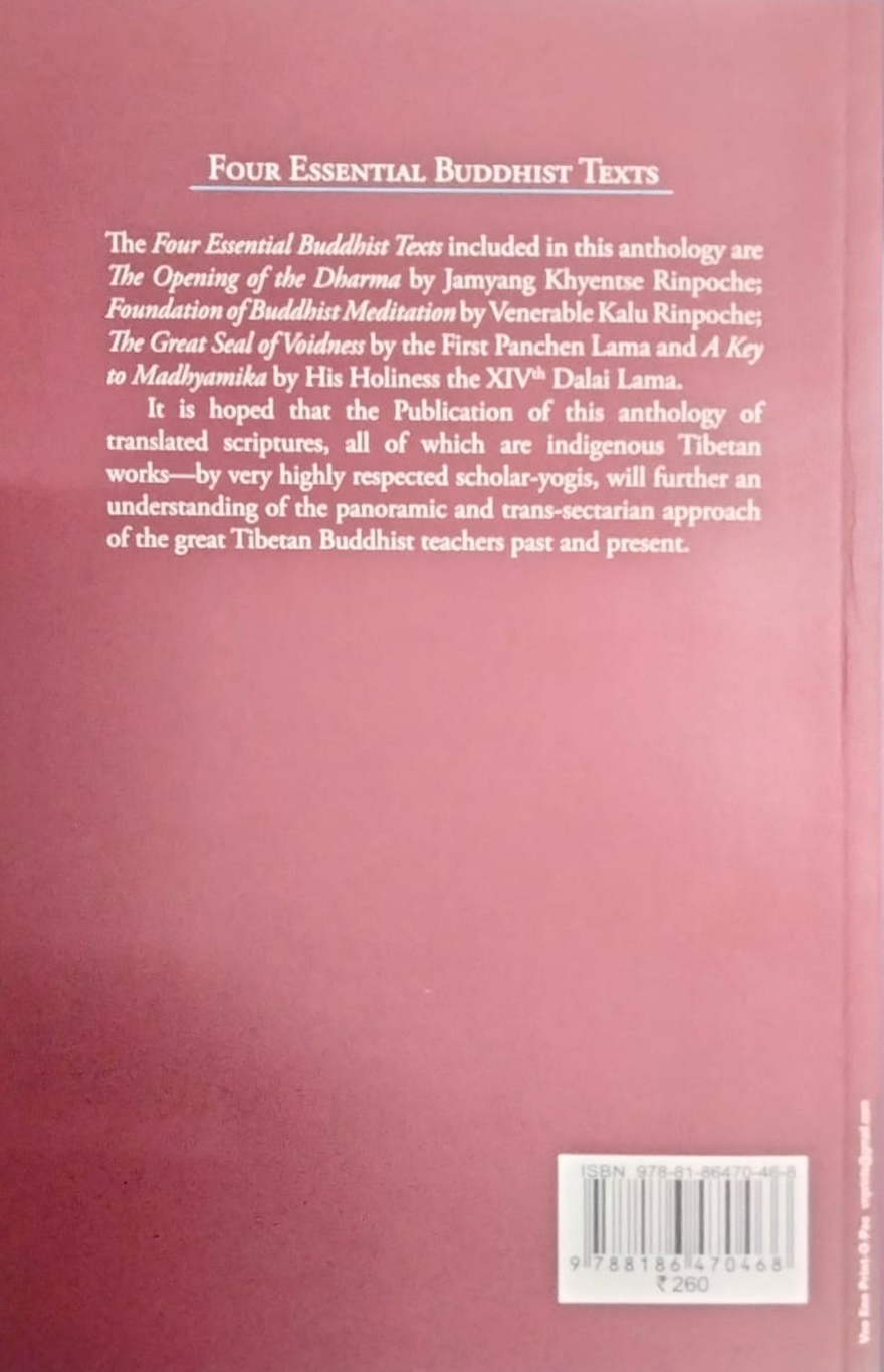The four Essential Buddhist Texts included in this anthology are The Opening of the Dharma by Jamyang Khyentse Rinpoche; Foundation of Buddhist Meditation by Venerable Kalu Rinpoche; The Great Seal of voidness by the first Panchen Lama and A Key to Madhyamika by his holiness the Fourteenth Dalai Lama. It is hoped that the publication of this anthology of translated scriptures all of which are indigenous Tibetan works by very highly respected scholar-yogis will further an understanding of the panoramic and trans-sectarian approach of the great Tibetan Buddhist teachers of past and present.