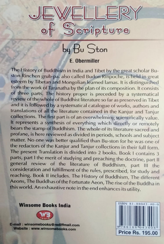 The History of Buddhism in India and Tibet by the great scholar Bu-ston Rinchen grub-pa. also called Budon Rinpoche is held in great esteem by Tibetan and Mongolian learned lamas. It is distinguished from the work of Taranatha by the plan of its composition. It consists of three parts. The history proper is preceded by a systematical review of the whole of Buddhist literature so far as preserved in Tibet and it is followed by a systematical catalogue of works authors and translations of all the literature contained in the Kanjur and Tanjur collections. The first part is of an overwhelming scientifically value. It represents a synthesis of everything which directly or remotely bears the stamp of Buddhism. The whole of its literature sacred and profane is here reviewed as divided in periods schools and subject matter. No one was better qualified than Bu-ston for he was one of the redactors of the Kanjur and Tanjur collections in their full form. The present Translation is divided into 2 books. Book I contains 3 parts part I the merit of studying and preaching the doctrine part II general review of the literature of Buddhism part III the consideration and fulfillment of the rules prescribed for study and reaching. Book II includes. The History of Buddhism The different Aeons The Buddhas of the Fortunate Aeon The rise of the Buddha in this world. An exhaustive note in the end enhances its utility.