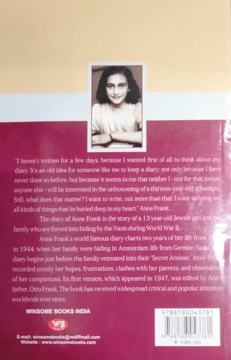 Anne Frank s world famous diary charts two years of her life from 1942 to 1944. when her family were hiding in Amsterdam life from German Nams diary begins just before the family retreated into their Secret Annexe Anne Fra recorded mostly her hopes frustrations clashes with her parents and observation of her companions. Its first version which appeared in 1947 was edited by Ann s father. Otto Frank. The book has received widespread critical and popular attention worldwide ever since.