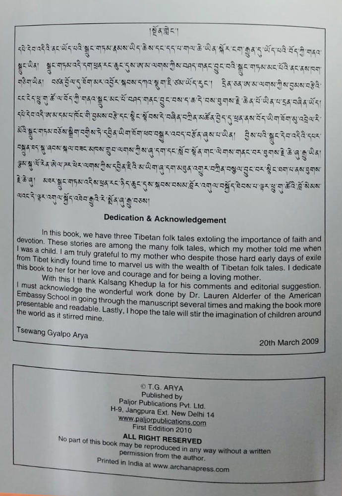In this book we have three Tibetan folk tales extoling the importance of faith and devotion. These stories are among the many folk tales which my mother told me when I was a child. I am truly grateful to my mother who despite those hard early days of exile from Tibet kindly found time to marvel us with the wealth of Tibetan folk tales. I dedicate this book to her for her love and courage and for being a loving mother.