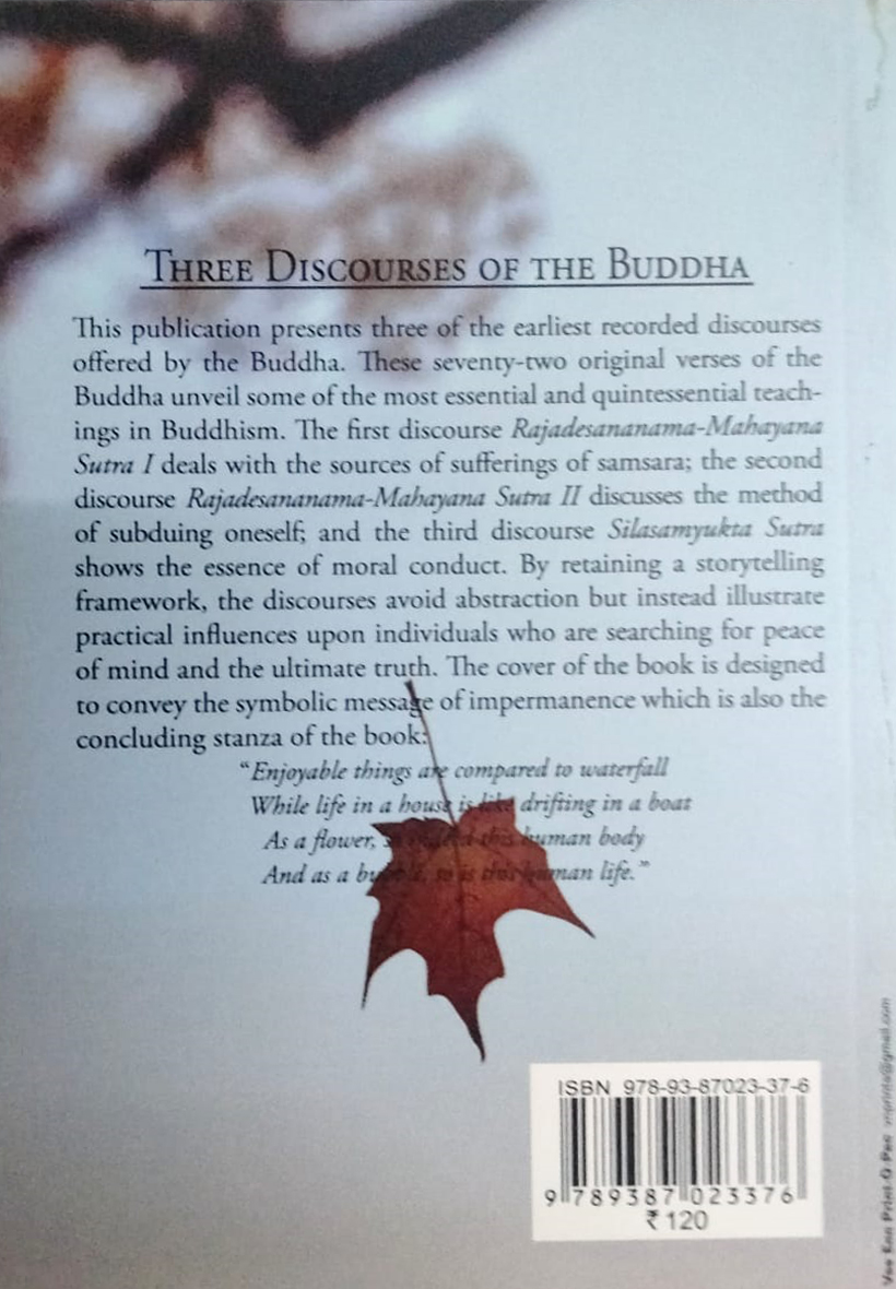 This publication presents of the earliest recorded discourses offered by the Buddhar. These seventy-two orginal verses of the Buddha unviel some of the most essential and quintessential teachings in Buddhism. The First discurse Rajadesananama-Mahayana Sutra I Deals with the sources of sufferings of samsara; the second discourse Rajadesananama-Mahayana Sutra II discusses the methor of subduing oneself; and the third discourse Silasamyukta Sutra shows the essence of moral counduct. By retaining a storytelling framework thediscourses avoid abstraction but insted illustrate practival influences upon individuals who are searching for peace of mind and the ultimate truth. The cover of the book is designed to convey the symbolic message of impermanence which is also the concluding stanza of the books.