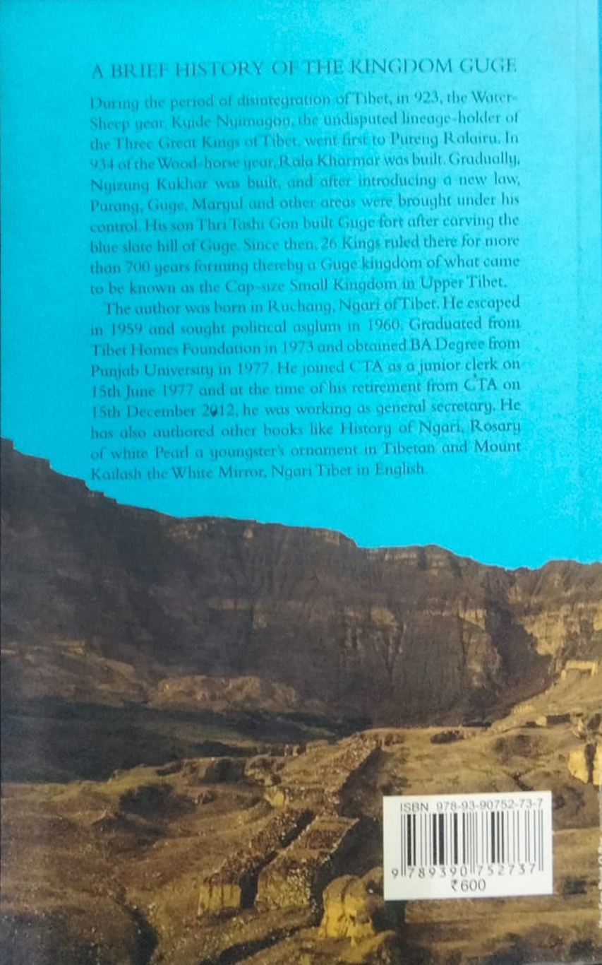 During the period of disintegration of Tibet in 923 the Water-Sheep year Kyide Nyimagon the undisputed lineage-holder of the Three Great Kings of Tibet went first to Pureng Ralairu. In 934 of the Wood-horse year Rala Kharmar was built. Gradually Nyizung Kukhar was built and after introducing a new law Purang Guge Maryul and other areas were brought under his control. His son Thri Tashi Gon built Guge fort after carving the blue slate hill of Guge. Since then 26 Kings ruled there for more than 700 years forming thereby a Guge kingdom of what came to be known as the Cap-size Small Kingdom in Upper Tibet. The author was born in Ruchang Ngari of Tibet. He escaped in 1959 and sought political asylum in 1960. Graduated from Tibet Homes Foundation in 1973 and obtained BA Degree from Punjab University in 1977. He joined CTA as a junior clerk on 15th June 1977 and at the time of his retirement from CTA on 15th December 2012 he was working as general secretary. He has also authored other books like History of Ngari Rosary of white Pearl a youngster’s ornament in Tibetan and Mount Kailash the White Mirror Ngari Tibet in English.