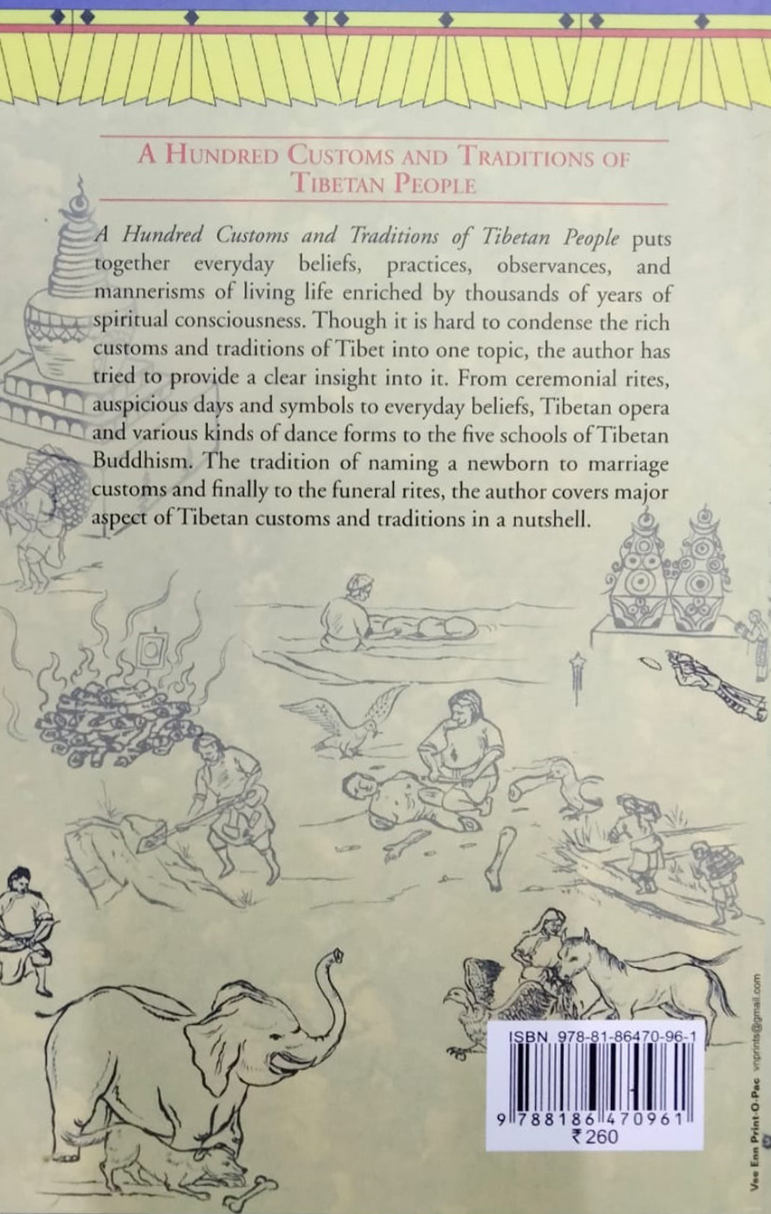 A hundred customs and traditions of Tibetan people is a translation of a book compiled and written by Sagong Wangdu and published by the people s publishing house in 2003. The book is intended to help foreigners and young Tibetan guides in negotiating the terrain of Tibetan culturalscape. The author claims the book to be free from his authorial judgments and an exact representation of the customs and traditions of Tibetan people as they exist in their lifestyle..