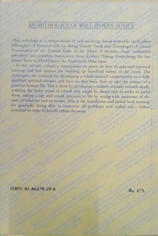 This anthology is a compendium of oral teachings based primarily on Kyabjey Pabongka s A Personal Gift for Being Utterly Freed and Tzongkapa s A Grand Presentation of the Graded Paths of the Mind. It includes many traditional anecdotes and guideline instructions from Kyabjey Trijamg Dorjechang the late Junior Tutor to His Holiness the Fourteenth Dalai Lama. In this volume complete instructions are given on how to approach spiritual training and best prepare for building up beneficial habits of the mind. The techniques are outlined for developing a whole-hearted commitment to a fully qualified spiritual mentor and then on that basis how to take the essence of a precious human life."synopsis" may belong to another edition of this title.