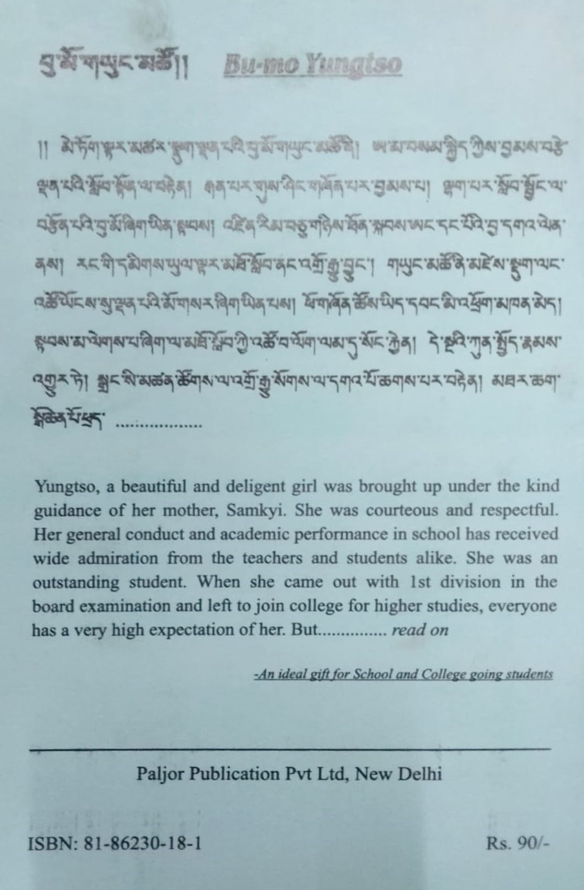Bumo guying most was first published in 1993 in Tibetan by the Author himself. Although hardly noticed it contains a very powerful message that needs to be brought to the notice of our youngsters as well as to the parents and the educators. It is a reality that many of our youngsters tend to deviate from our value system as they grow and gain more exposure to the outside world. Growing number of school and college dropouts bear testimony to this trend. It is not all the children’s fault; we all are also responsible for this. Media and demonstrative effect of this modern world is taking our youngsters for a ride. Besides academic syllabus we need to evoke and cultivate in our children the essentials of our social and moral values so that a good girl like Yungtso (our generation) do not get confused in the middle and become degenerated. We can not afford this at this moment of our history. Parents and elders can remind their young ones of Yungtso’s story. It can be an ideal gift to the children. I sin- cerely hope that the story of Yungtso will serve as a rein and a reminder to all those youngsters galloping to the path of degeneration and come into the fold of our society to serve our common cause.