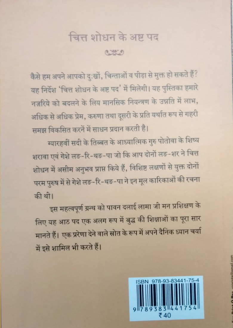 कैसे हम अपने आपको दुःखों चिन्ताओं व पीड़ा से मुक्त हो सकते हैं? यह निर्देश चित्त शोधन के अष्ट पद में मिलेगी। यह पुस्तिका हमारे नजरिये को बदलने के लिय मानसिक नियन्त्रण के उन्नति में लाभ अधिक से अधिक प्रेम करुणा तथा दूसरी के प्रति यर्थात रूप से गहरी समझ विकसित करनें में साधन प्रदान करती है।