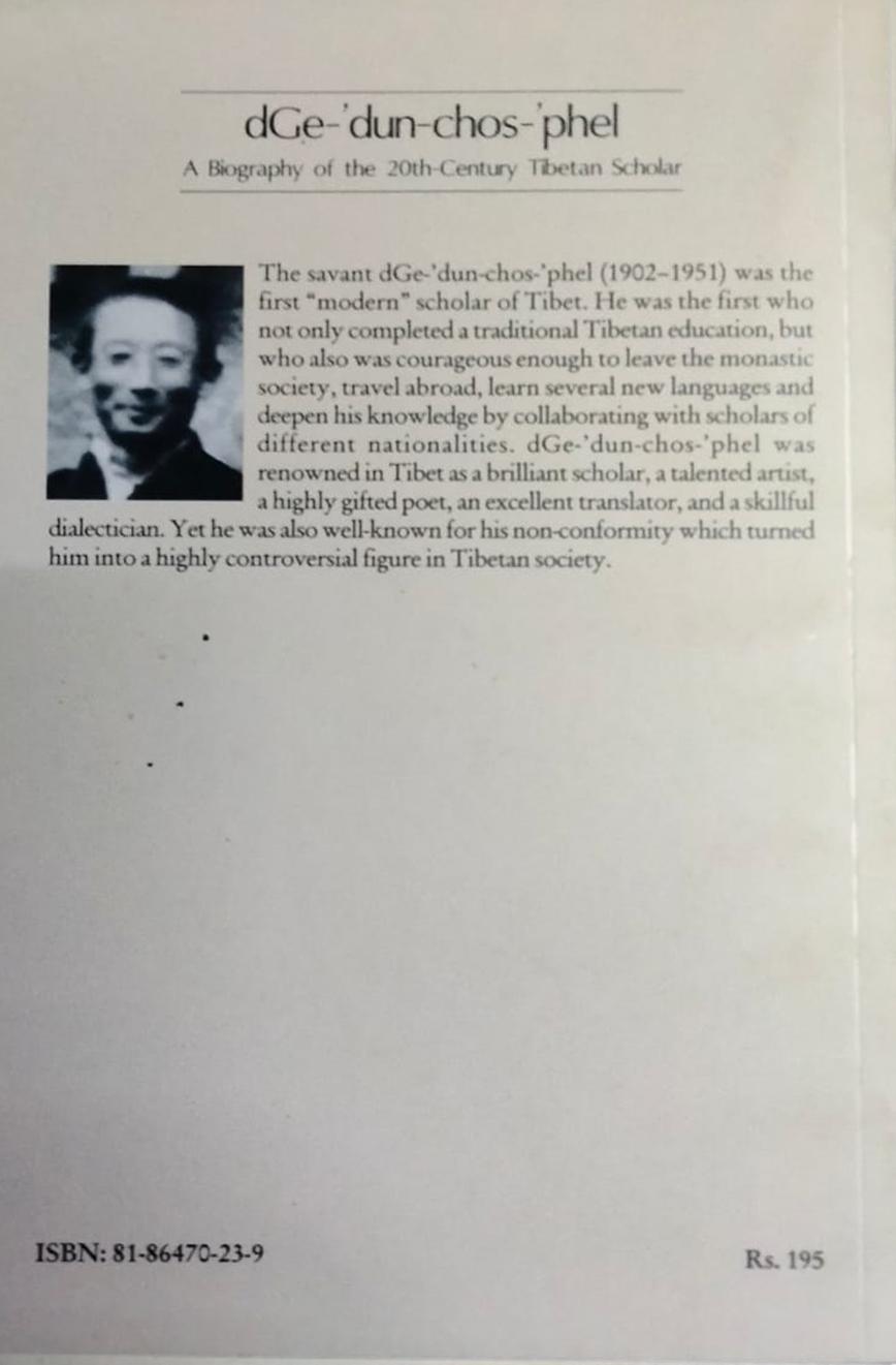 The savant dGe- dun-chos- phel (1902-1951) was the first "modern" scholar of Tibet. He was the first who not only completed a traditional Tibetan education but who also was courageous enough to leave the monastic society travel abroad learn several new languages and deepen his knowledge by collaborating with scholars of different nationalities. dGe- dun-chos- phel was renowned in Tibet as a brilliant scholar a talented artist a highly gifted poet an excellent translator and a skillful dialectician. Yet he was also well-known for his non-conformity which turned him into a highly controversial figure in Tibetan society.