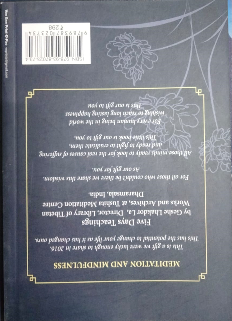 MEDITATION AND MINDFULNESS This is a gift we were lucky enough to share in 2016.This has the potential to change your life as it has changed ours. Five Days Teachings by Geshe Lhakdor La Director Library of Tibetan Works and Archives at Tushita Meditation Centre Dharamsala India. For all those who couldn t be there we share this wisdom. As our gift for you. All those minds ready to look for the real causes of suffering and ready to fight to eradicate them This little book is our gift to you For every human being in the world wishing to reach long lasting happiness This is our gift to you