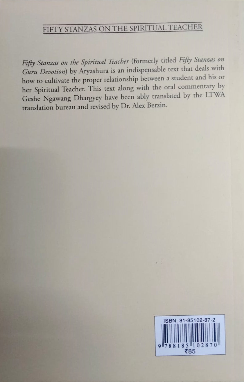 Fifty Stanzas on the Spiritual Teacher (formerly titled Fifty Stanzas on Guru Devation ) by Aryashura is an indispensable text that deals with how to cultivate the proper relationship between a student and his or her Spiritual Teacher.This text along with the oral commentary by the LTWA translation bureau and revised by Dr. Alx Berzin.