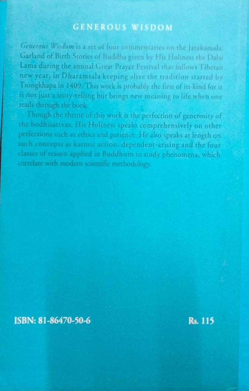 Generous wisdom is a set of four commentaries on the Jatakamala: Garland of birth stories of Buddha given by His Holiness the Dalai Lama during the annual great prayer festival that follows Tibetan New Year in Dharamsala keeping alive the tradition started by Tsongkhapa in 1409. This work is probably the first of its kind for it is not just a story-telling but brings new meaning to life when one reads through the book.