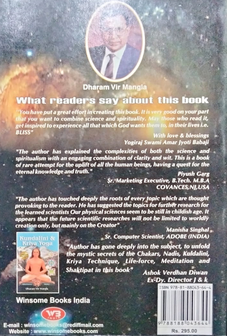 About the Author Sh. Dharam Vir Mangla M.Sc. M.Ed. PGDCA retired Principal got his masters degrees from University of Delhi. He belongs to a spiritual educated family. He is an extraordinary combination of spiritual and scientific bent of mind. He joined his Ph.D. in Mathematics at Delhi University in 1969. Since then he is practicing yoga and have the opportunity of the company and blessings of great saints. He used to discuss about God Shastras and Sciences with the saints and scientists. He has fully devoted his life in the pursuit of God spiritual studies and yoga practices. He served as a lecturer in Mathematics at University of Aden and worked as Principal in Delhi. He is a disciple of Paramhansa Yogananda and practicing Kriya Yoga since long. He is a scholar of Science Mathematics Education and Philosophy. He has the ability to correlate Sciences Shastras Spiritual Science and God. His books are the rare masterpieces based upon his spiritual experiences and vast studies which are useful for both believers and non-believers. Besides his scientific-cum-spiritual discourses at various places he also conducts seminars workshops for management and professionals on Reduce Stress through Self-Management and Positive Art of Thinking . Sri Mangla is the founder of God Realization Foundation (GRF) in Delhi. It helps the seekers of God to answer their personal queries. On the basis of many e-Spiritual Tests conducted by the foundation members are accordingly advised for their eligibility of initiation in Kriya Yoga . His writings are scientific commendable research work and a reservoir for further scientific researches. Sri Mangla is a renowned author of eight advanced level spiritual books of international standard which have been appreciated by reputed readers saints educationists and scientists all over the world. His two books God & Self-Realization & Kundalini & Kriya Yoga has revolutionized the spiritual world.