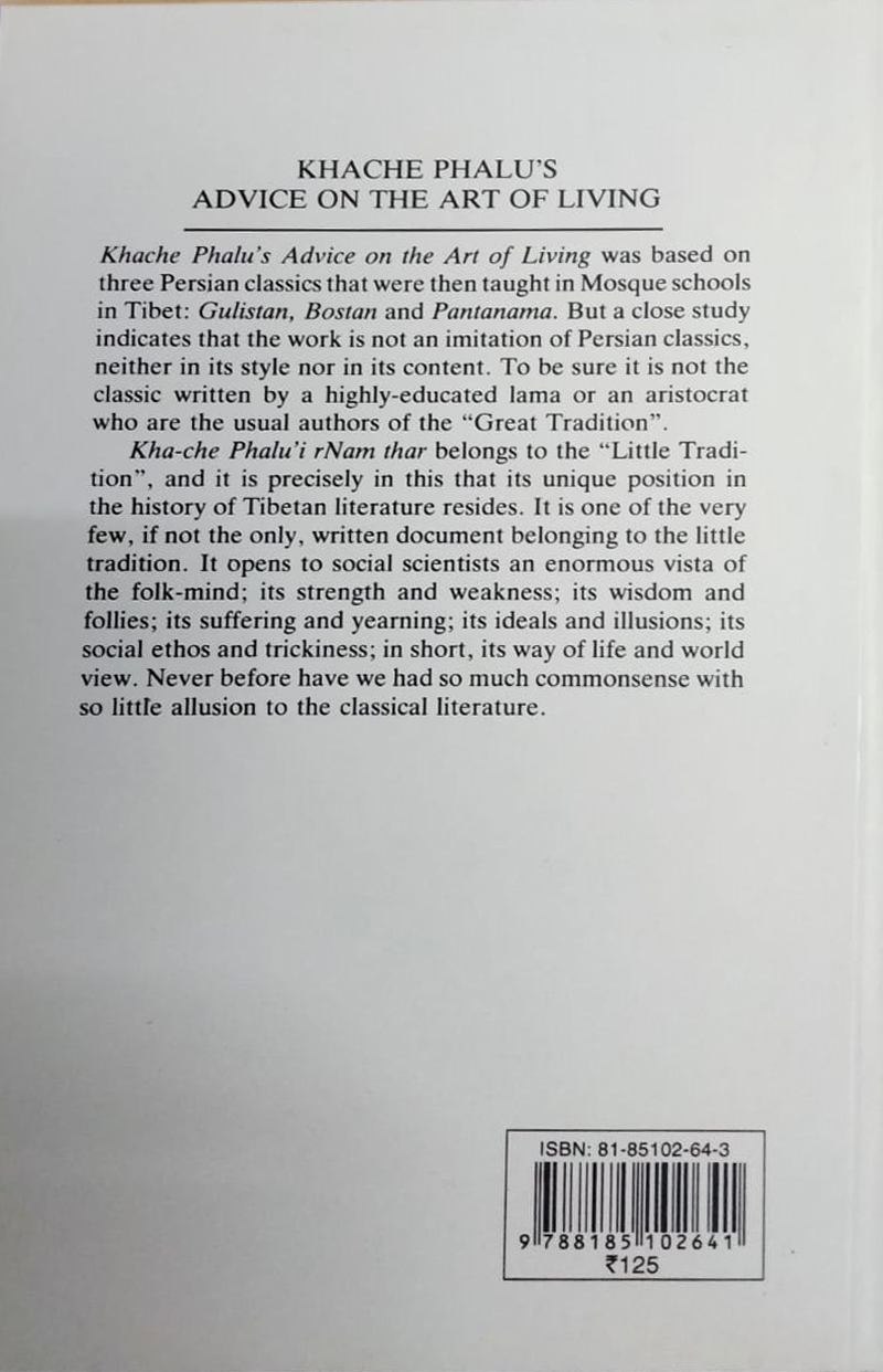 Khache Phalu s Advice on the Art of Living was based on three Persian classics that were then taught in Mosque schools in Tibet: Gulistan Bastan and Pantanama. But a close study indicates that the work is not an imitation of Persian classics neither in its style nor in its content. To be sure it is not the classic written by a hightly educated lama or an aristorcrat who are the usual authers of the "Great Traditio".