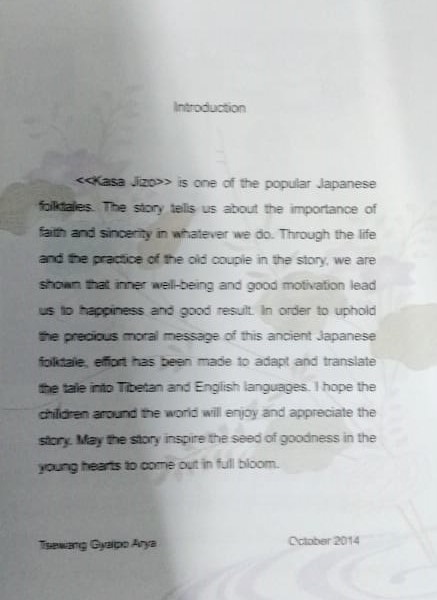 is one of the popular Japanese folktales. The story tells us about the importance of faith and sincerity in whatever we do. Through the life and the practice of the old couple in the story we are shown that inner well-being and good motivation lead us to happiness and good result. In order to uphold the precious moral message of this ancient Japanese folktale effort has been made to adapt and translate the tale into Tibetan and English languages I hope the children around the world will enjoy and appreciate the story. May the story inspire the seed of goodness in the young hearts to come out in full bloom.