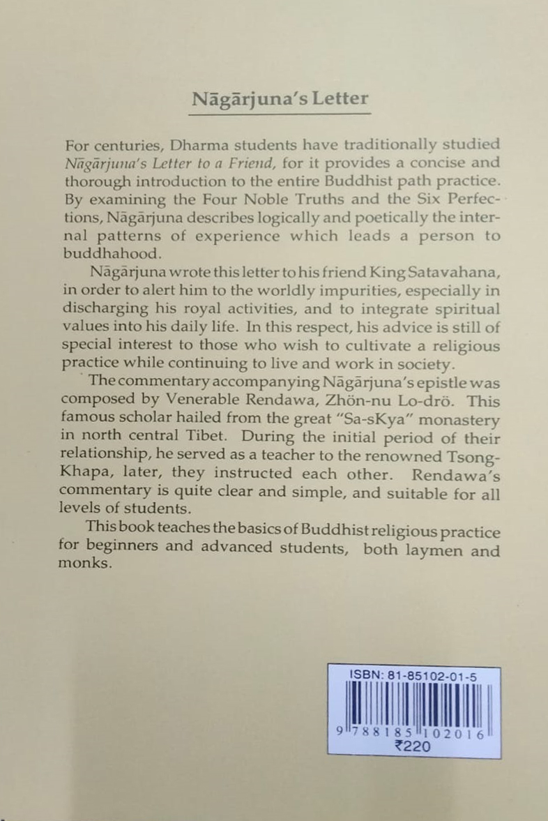 For centuries Dharma students have traditionally studied Nagarjuna s Letter to a Friend for it provides a concise and thorough introduction to the entire Buddhist path practice. By examining the Four Noble Truths and the Six Perfec-tions Nagarjuna describes logically and poetically the internal patterns of experience which leads a person to buddhahood. Nagarjuna wrote this letter to his friend King Satavahana in order to alert him to the worldly impurities especially in discharging his royal activities and to integrate spiritual values into his daily life. In this respect his advice is still of special interest to those who wish to cultivate a religious practice while continuing to live and work in society. The commentary accompanying Nagarjuna s epistle was composed by Venerable Rendawa Zhön-nu Lo-drö. This famous scholar hailed from the great "Sa-sKya" monastery in north central Tibet. During the initial period of their relationship he served as a teacher to the renowned song-Khapa later they instructed each other. Rendawa s commentary is quite clear and simple and suitable for all levels of students. This book teaches the basics of Buddhist religious practice for beginners and advanced students both laymen and monks.