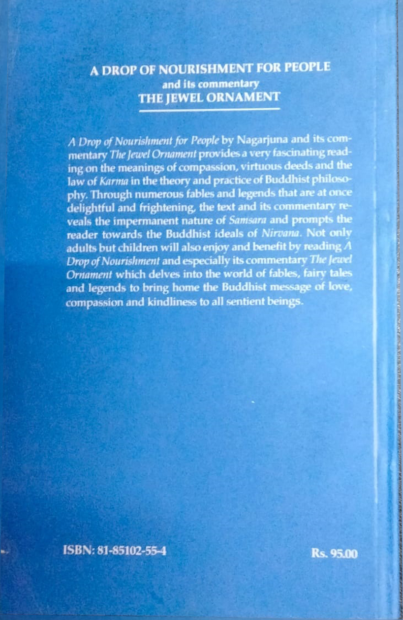 A Drop of Nourishment for People by Nagarjuna and its commentary The Jewel Ornament provides a very fascinating reading on the meaning of compassion virtuous deeds and the law of Karma in the theory and practice of Buddhist philosophy. Through numerous fables and legends that are at once delightful and frightening the text and its commentary reveals the impermanent nature of Samsara and prompts the reader towards the Buddhist ideals of Nirvana. Not only adults but children will also enjoy and benefit by reading A Drop of Nourishment and especially its commentary The Jewel Ornament which delves into the world of fables fairy tales and legends to bring home the Buddhist message of love compassion and kindliness to all sentient beings.
