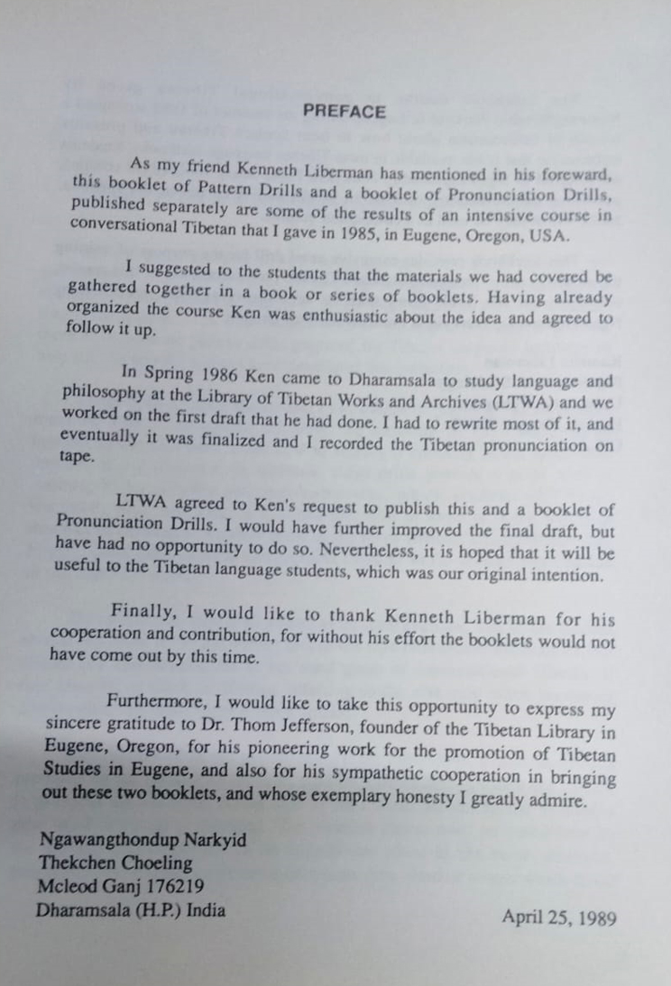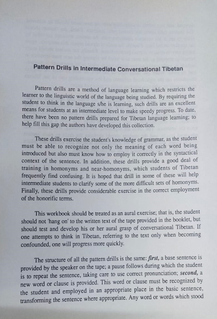 As my friend Kenneth Lieberman has mentioned in his foreword this booklet of Pattern Drills and a booklet of Pronunciation Drills published separately are some of the results of an intensive course in conversational Tibetan that I gave in 1985 in Eugene Oregon USA.