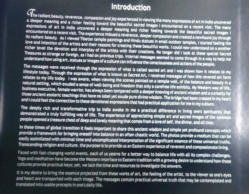 The radiant beauty reverence compassion and joy experienced in viewing the many expressions of art in India uncovered a deeper meaning and a richer feeling toward the beautiful sacred images I encountered on a recent visit. The many expressions of art in India uncovered a deeper meaning and richer feeling towards the beautiful sacred images I encountered on a recent visit. The experience imbued a reverence deeper compassion and created a newfound joy through its radiant beauty. As I viewed Tibetan temple paintings and Hindu statues in small outdoor temples I started feeling the love and intention of the artists and their reasons for creating these beautiful works. I could now understand on a another richer level the devotion and interplay of the artists with their creations. No longer did I look at these special Sacred Treasures as strange or foreign as I had on previous trips. Internal messages seemed to come through in a way to help me understand how using art statues or images of a culture can influence the consciousness and actions of the people.