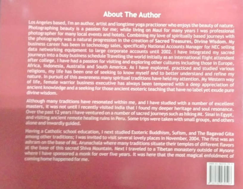 Los Angeles based I’m an author artist and longtime yoga practioner who enjoys the beauty of nature. Photographing beauty is a passion for me; while living on Maui for many years I was professional photographer for many local events and hotels. Combining my love of spiritually based journeys with the photography was a natural progression in the creation of Sacred Treasures Divine Wisdom. My business career has been in technology sales specifically National Accounts Manager for NEC selling data networking equipment to large corporate accounts until 2002. I have integrated my sacred journeys into a busy business schedule Traveling the world initially as an international flight attendant after college I have had a passion for visiting and exploring other cultures including those in Europe Africa Indonesia Australia and South America. As I have explored practiced and studied various religions my life has been one of seeking to know myself and to better understand and refine my nature. In pursuit of this awareness many spiritual traditions have held my attention. My Western way of life female warrior business executive has always been tempered with a deep appreciation of ancient knowledge and a seeking for those ancient esoteric teaching that have no label yet exude pure divine wisdom.