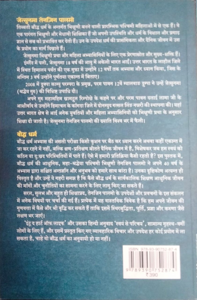बौद्ध धर्म बौद्ध धर्म अभ्यास की असली परीक्षा किसी कुशन पर बैठ कर ध्यान करने अथवा कहीं एकान्त में जा कर रहने में नहीं बल्कि क्षण-प्रतिक्षण बीतते दैनिक जीवन में है विशेषकर जब हम स्वयं को कठिन या दुःखद परिस्थितियों में पाते हैं। ऐसे में हमारी प्रतिक्रिया कैसी रहती है? इस पुस्तक में बौद्ध धर्म की आधुनिक महा-श्रद्धया पश्चिमी भिक्षुणी तेनजिन पालमो ने अपने 40 वर्ष के अभ्यास द्वारा सञ्चित अन्तर्ज्ञान और अनुभव को हमारे साथ बांटा है। उनका दृष्टिकोण अत्यन्त ही विस्तृत है और उन्हें ये गहरी समझ है कि कैसे बौद्ध धर्म के सार्वकालिक शिक्षण आधुनिक जीवन की माँगों और चुनौतियों का सामना करने के लिए लागू किए जा सकते हैं।