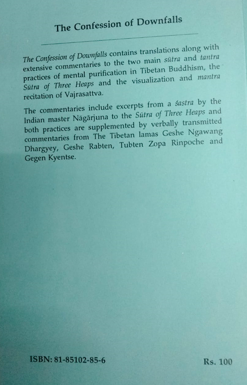 The Confession of Downfalls contains translations along with extensive commentaries to the two main sutra and tantra practices of mental purification in Tibetan Buddhism the Sutra of Three Heaps and the visualization and mantra recitation of Vajrasattva.- The commentaries include excerpts from a sastra by the Indian master Nagarjuna to the Sutra of Three Heaps and both practices are supplemented by verbally transmitted commentaries from The Tibetan lamas Geshe Ngawang Dhargyey Geshe Rabten Tubten Zopa Rinpoche and Gegen Kyentse.