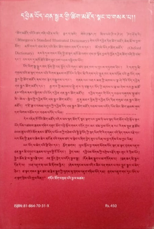 For many centuries eminent scholar. Lamas and accomplished Siddhis of India and Tbet had collaborared in producing a vast literary corpus translated into Tibetan from Sanskrit involving years of hard labour and patient persevernce. Direct translations into Tibetan of such sacred and monumental works as the Tripitaka the Tantra Sastras (recognized as the direct expressions of the Buddha) and the commentaries and expositions of such great figures as Nagarjuna Asanga and the others collectively known as the Six Ornamets and Two Excellencies were produced. These traslated texts were studied practised and propagated and in the process fresh expositions were added.The Dharma Flourished like golden sunshine in the Land of Snows. This period the most glorious chapter in the annals of Tibet is a personal source of pride to the Tibetans.As a high-water-mark of intellectual civilisation its significance is timeless.It is in the very fitness of things that we Tibetans should ever remember in gratitude those great persongages of bygone Tibet. Author : This comprehensive English - Tibetan Dictionary compiled and edited by Dhongthog Tanpi Gyalrshan is much welcomed. It fills an important gap in our present needs.It is my sincere hope that more learned scholars will come forward in the near future and participate actively in making every field of study availed in the Tibetan Language. It is also my hope that the rich Buddhist philosophy and its deep meanings which now exist only in the Tibetan language can be made available to all those who are interested in them.