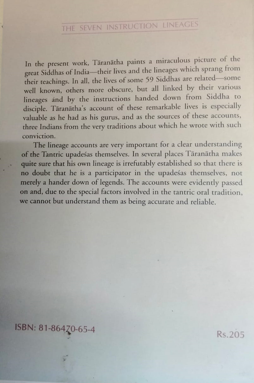 In the present work Taranatha paints a miraculous picture of the great Siddhas of India their lives and the lineages which sprang from their teachings In all the lives of some 59 Siddhas are related some well known others more obscure but all linked by their various lineage and by the instructions handed down from Siddha to disciple. Tarantha’s account of these remarkable lives is especially valuable as he had his gurus and as the sources of these accounts three Indians from the very traditions about which he wrote with such conviction.