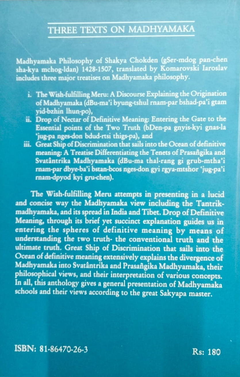 The Wish-fulfilling Meru attempts in presenting in a lucid and concise way the Madhyamaka view including the Tantrik-madhyamaka and its spread in India and Tibet. Drop of Definitive Meaning through its brief yet succinct explanation guides us in entering the spheres of definitive meaning by means of understanding the two truth- the conventional truth and the ultimate truth. Great ship of Discrimination that sails into the Ocean of definitive meaning extensively explains the divergence of philosophical views and their interpretation of various concepts. In all this anthology gives a general presentation of Madhyamaka schools and their views according to the great Sakyapa master.