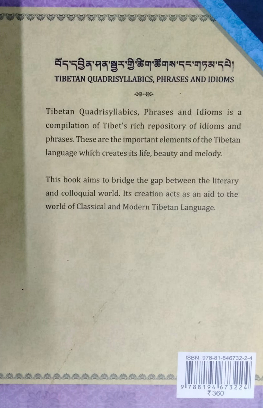 Tibetan Quadrisyllabics Phrases and Idioms is a compilation of Tibet s rich repository of idioms and phrases. These are the important elements of the Tibetan language which creates its life beauty and melody.This book aims to bridge the gap between the literary and colloquial world. Its creation acts as an aid to the world of Classical and Modern Tibetan Language.